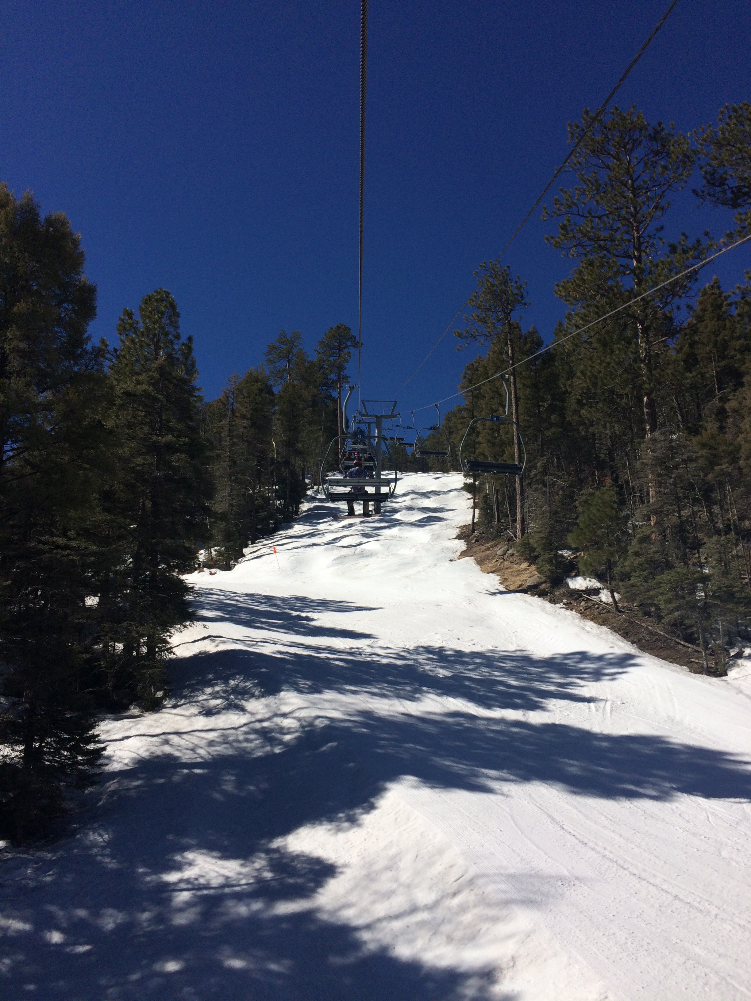 With bright sunshine and temperatures hitting the high 40s in the base area following a good freeze overnight, I was treated to near-perfect spring corn snow. Advanced trails like Lumberyard, Wildcat, and Mal’s Run had nice moguls, while the lower half of the Aspen liftline and the intermediate Pussycat run were perfectly groomed for great cruising. Venturing a little further east, Lone Spruce and Daisy Mae offered up more smooth cruising with a mellower pitch, and I imagine that side of the mountain would be perfect for novices and low intermediates. The steep “fab four” off the Mother Chair – Nuther Mother, Sidewinder, Breathless, and Precious – are said to offer up some of the best bump skiing in New Mexico. While they weren’t accessible during my visit, it looked like they would have some fun terrain.