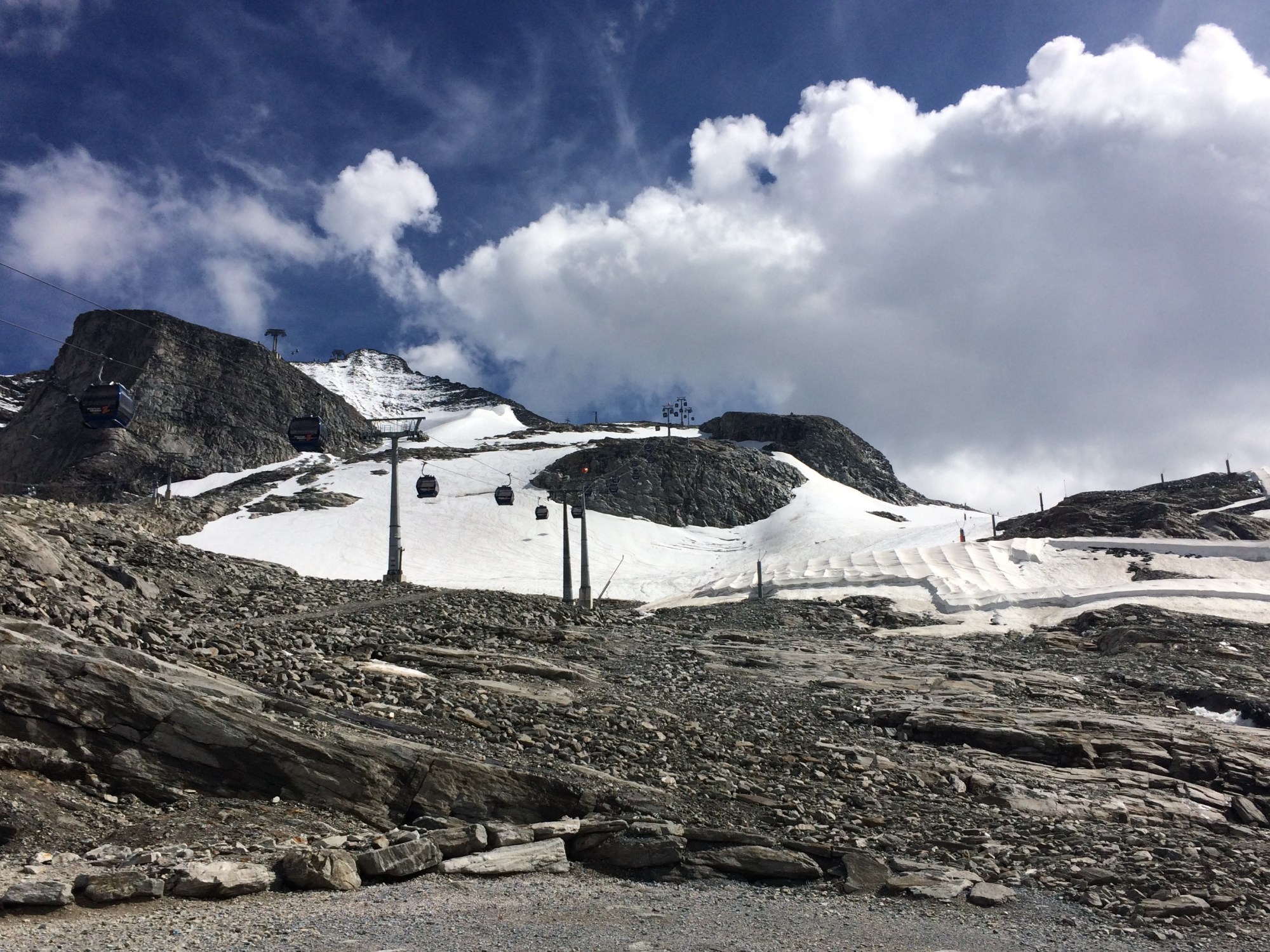 The summer skiing is limited to a wide, intermediate-pitched snowfield with three different groomed routes from top to bottom paralleling each other. While the terrain might be somewhat boring, I was lucky that 20-30 cm of new snow had fallen just a couple days before my visit. I had a great time skiing the untracked, but slightly heavier and wetter, powder in between the groomed areas. There was also just enough snow to be able to enjoy the steeper area beneath the lift, a black run that was technically closed.