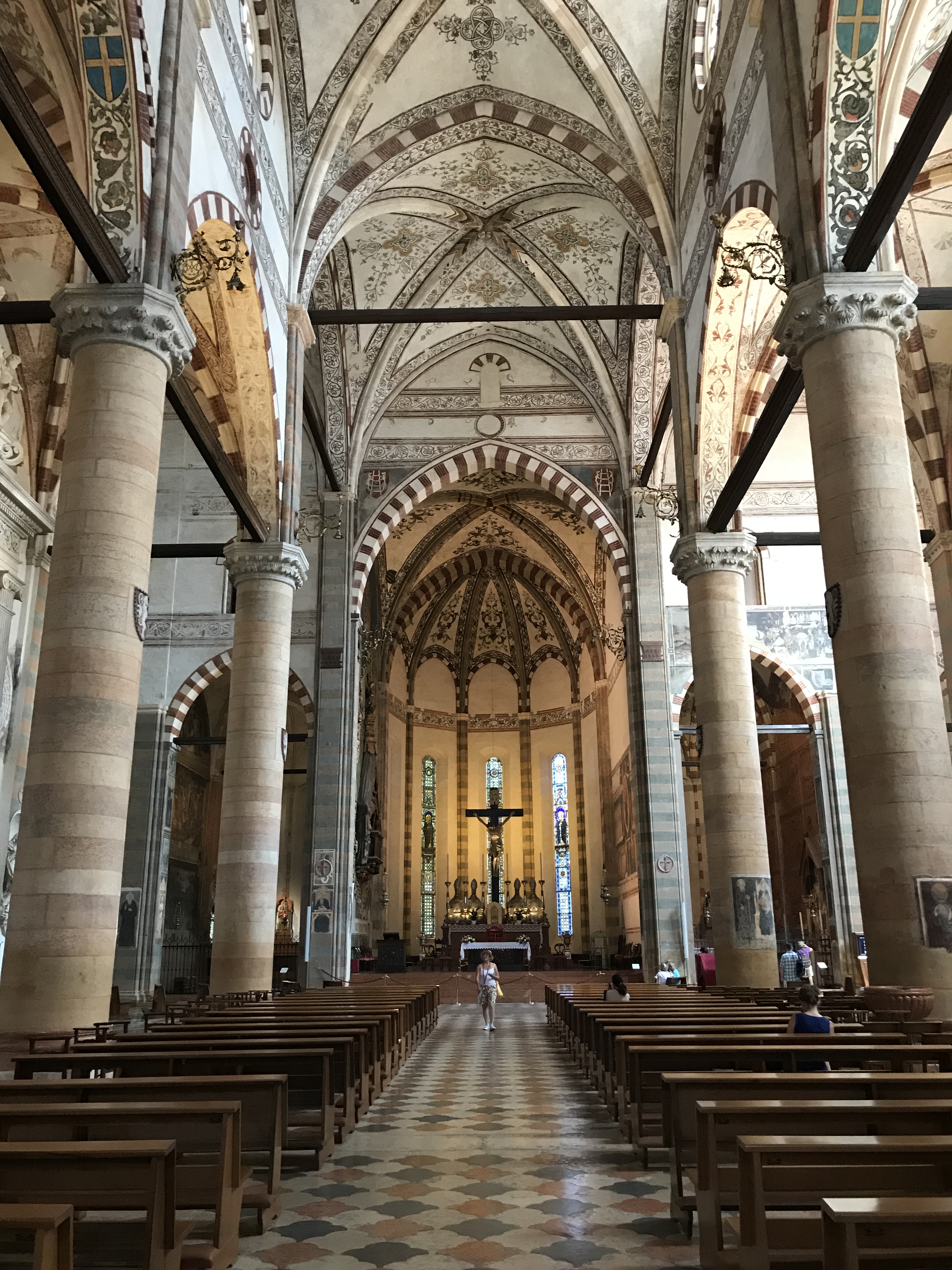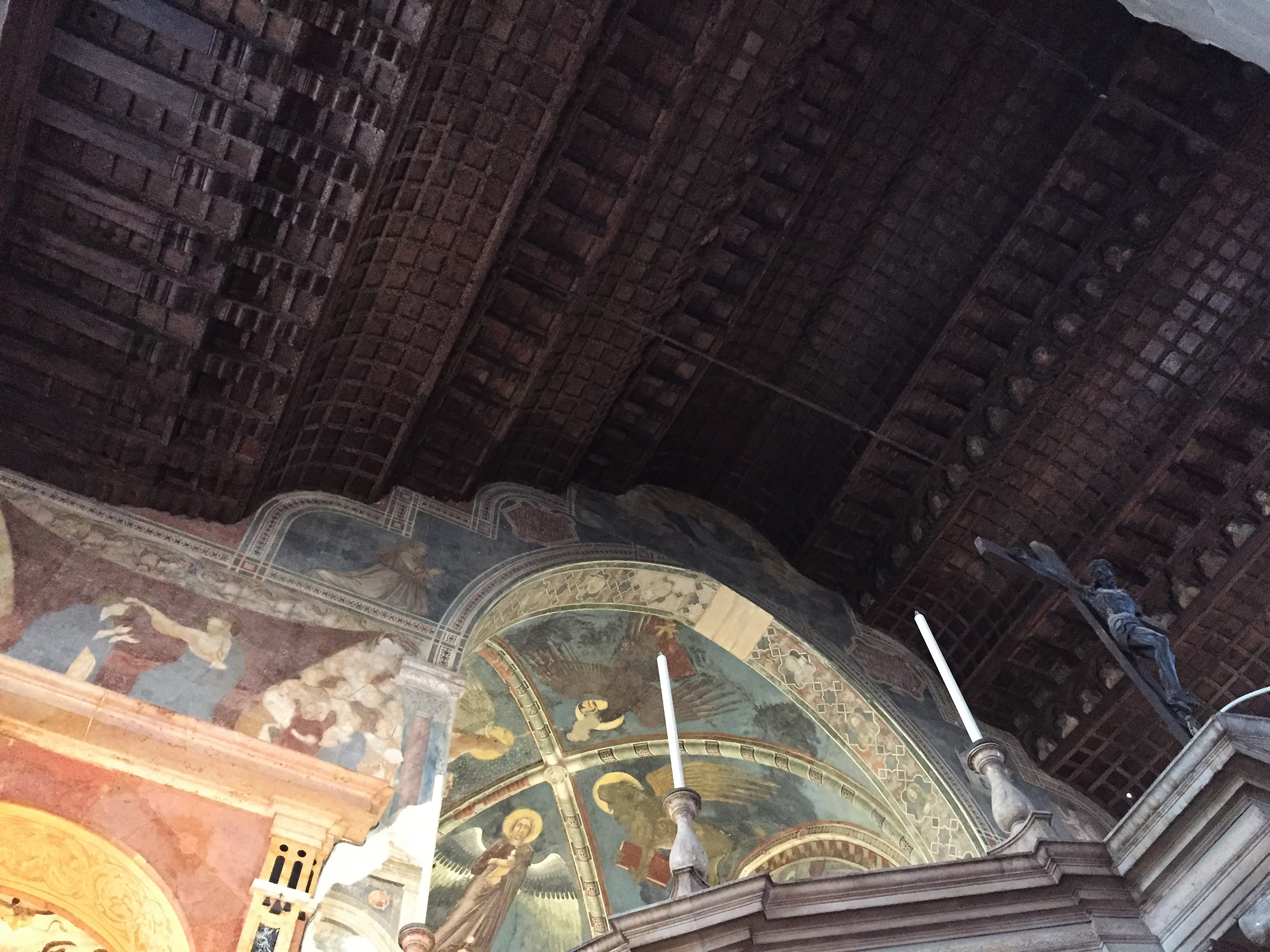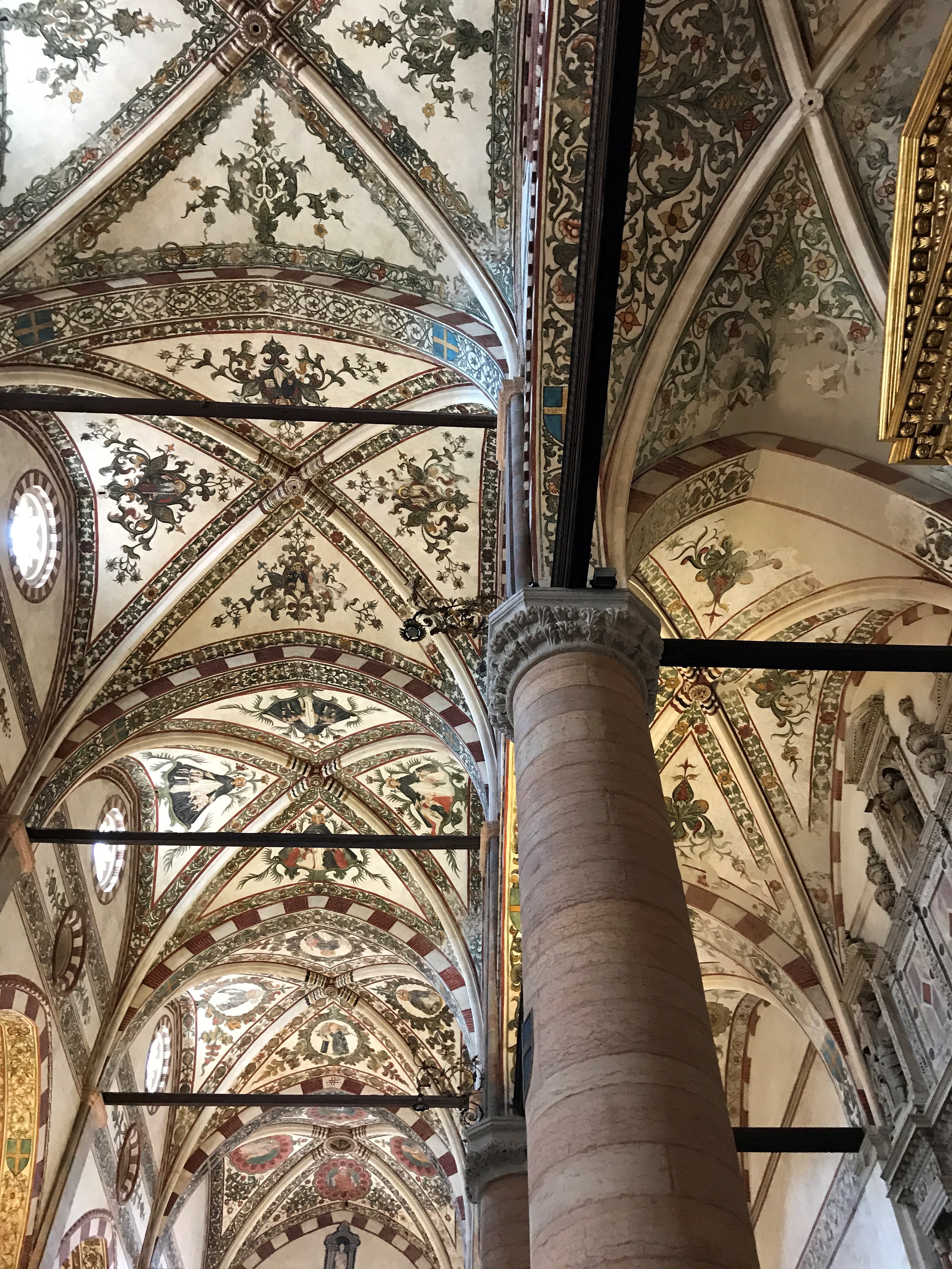 Chiesa di San Fermo Maggiore: The Gothic San Fermo is worth visiting for the ceiling alone. The church features an ornate vaulted wooden ceiling (known as a “ship’s hull” ceiling) that includes rows of painted saints peeking out from arches along the length of the nave. There is also a lower church that has frescos dating back to the 11th century. San Fermo houses one of the most impressive pieces of art that we saw—the mausoleum of Nicolò Brenzoni which is a mixed-media creation of sculpture and fresco painting vaulting out of the church wall. Originally it was covered with custom metalwork as well which would have made it all the more impressive!