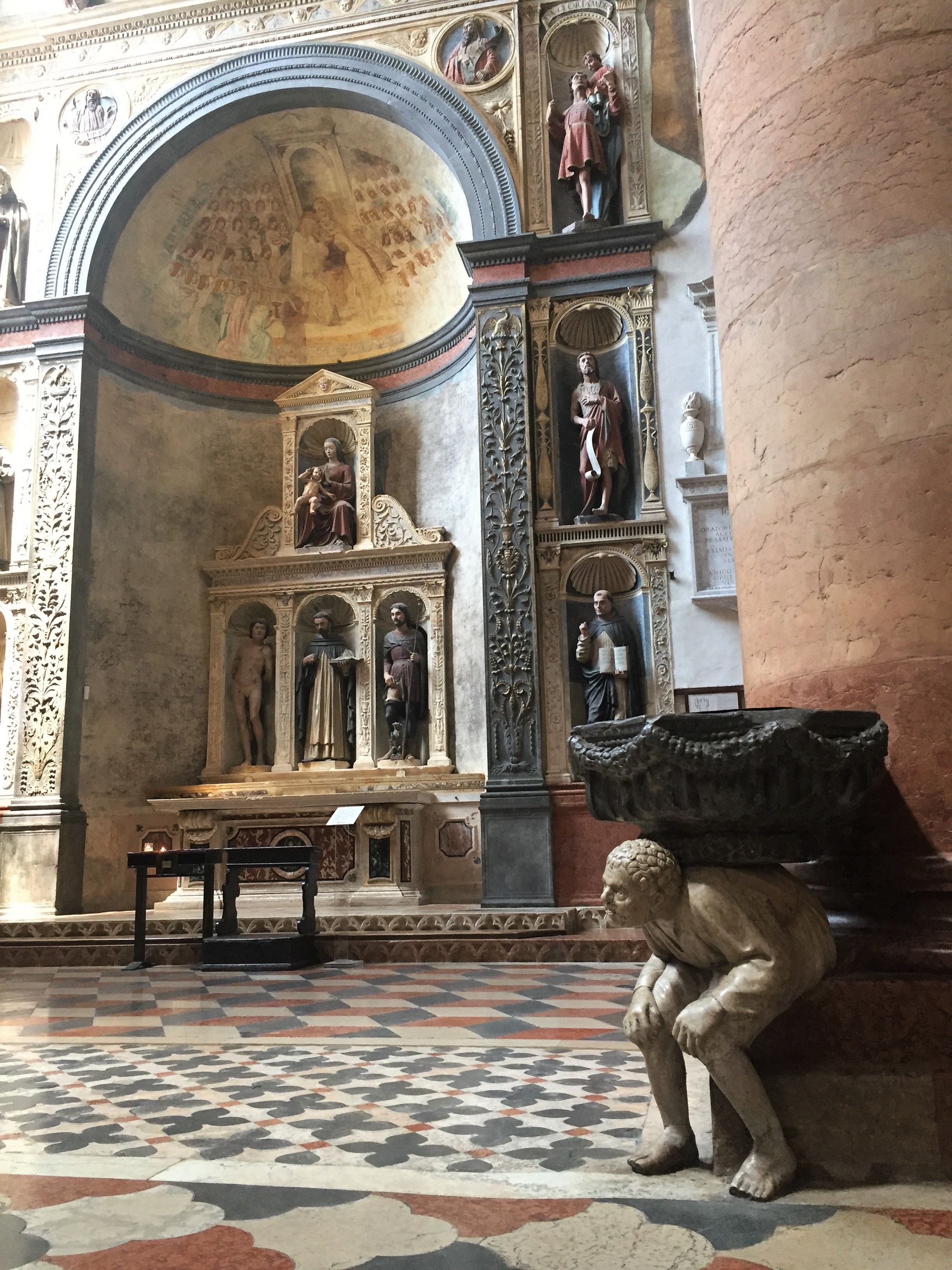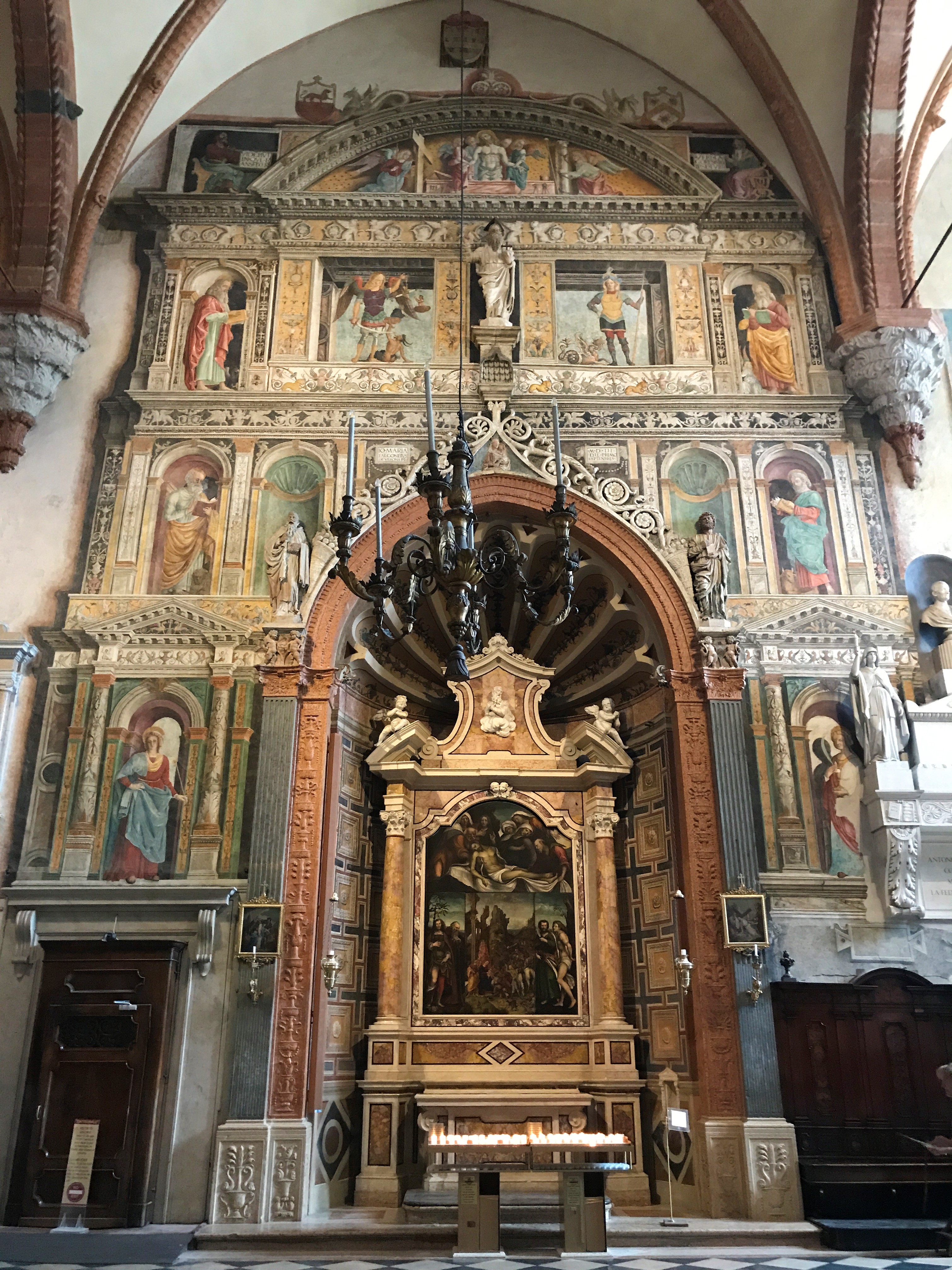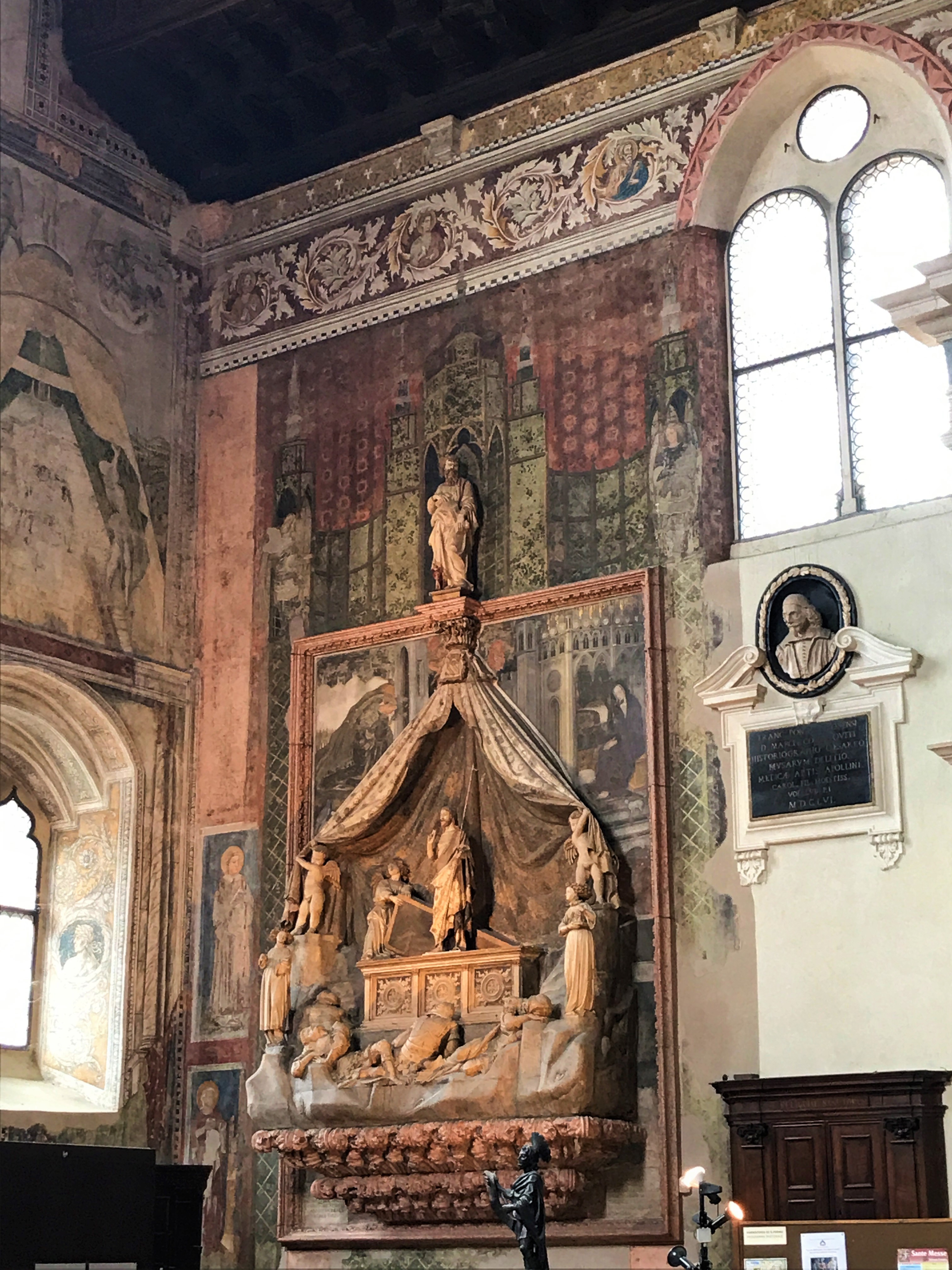 Chiesa di San Fermo Maggiore: The Gothic San Fermo is worth visiting for the ceiling alone. The church features an ornate vaulted wooden ceiling (known as a “ship’s hull” ceiling) that includes rows of painted saints peeking out from arches along the length of the nave. There is also a lower church that has frescos dating back to the 11th century. San Fermo houses one of the most impressive pieces of art that we saw—the mausoleum of Nicolò Brenzoni which is a mixed-media creation of sculpture and fresco painting vaulting out of the church wall. Originally it was covered with custom metalwork as well which would have made it all the more impressive!