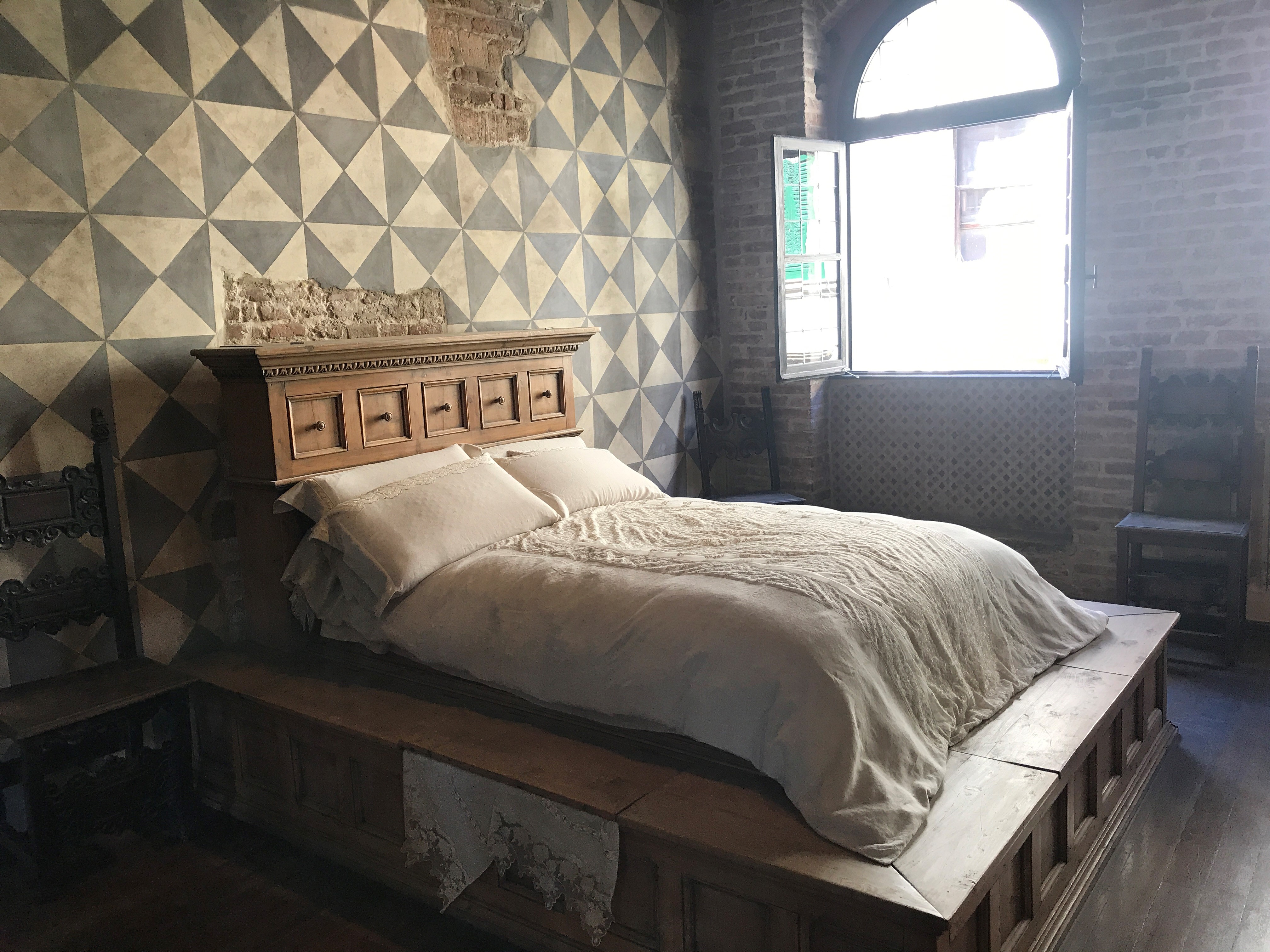 One of the most popular sites in the city is Casa di Giulietta (Juliette’s House). A complex of buildings in the historic city center, the building was once the seat of the Dal Cappello family and is now a museum dedicated to the myth of the star-crossed lovers. It seemed that most visitors weren’t interested in touring the museum itself, but preferred to take pictures with the Juliet statue in the courtyard, pose on the Juliet balcony (which was added in a building restoration in 1938), and leave love notes and graffiti in the entrance corridor to the courtyard. The museum has a mixed display of period furniture and art as well as Romeo and Juliet movie paraphernalia, but it is not very extensive and we likely wouldn’t have visited if it were not included on the Verona Card.