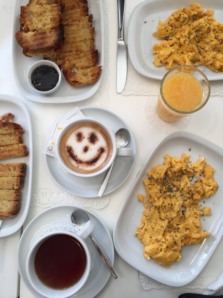 For a more substantial breakfast, we enjoyed Mercador Café located on the pedestrian Rua das Flores, not far from the train station. The ovo no forno (oven baked eggs) were fantastic, and they can also do a vegetarian version with mushrooms which isn’t featured on the menu. We also made the trek up the hill to Dama Pé de Cabra, a small grocery store turned cafe with a small handful of tables both inside and out. They have a simple brunch menu featuring eggs and specialty breads, and they offer a comprehensive breakfast sampler including juice, a hot drink, scrambled eggs, and different types of Portuguese bread. The breads are worth the trip! The rustic bread (a more traditional version) is served with a port wine reduction, and you can also choose their carrot, pumpkin or chestnut breads (we sampled all varieties!).