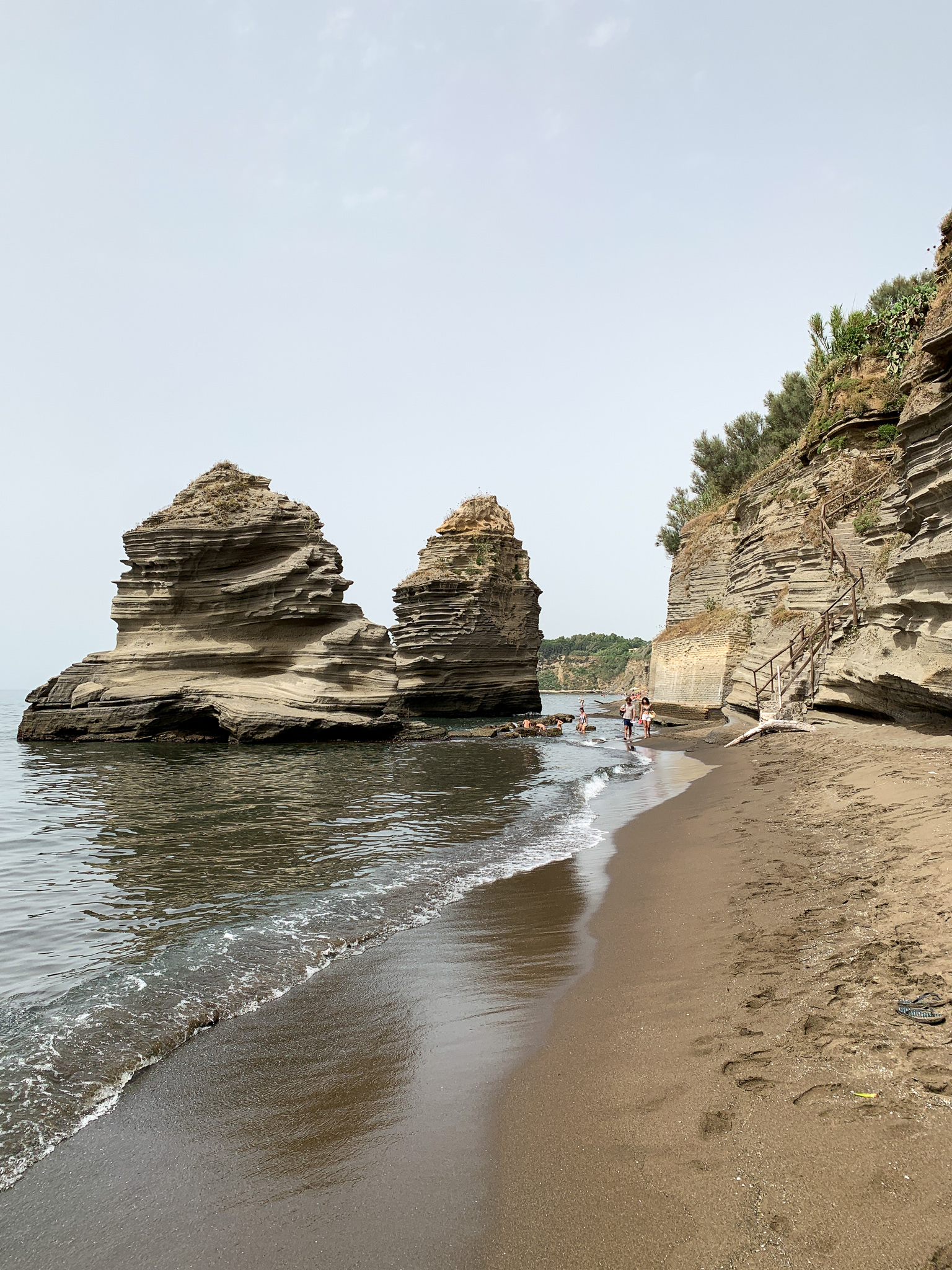 As an island destination, naturally many people come to Procida for the beaches. Our “local” beach while staying in Corricella was Chiaia, a 15 minute walk from Corricella port. We loved this little slice of black sand beach, with ample “free” beach space in addition to a small beach club. Since this beach is on the east side of the island tucked beneath a tall cliff it was nicely shaded in the afternoon. The black sand retained the day’s heat, yet we weren’t being baked in the sun – a perfect situation. Chiaiolella beach on the southwestern side of the island gets full sun and was super hot the day we visited – black sand and full sun, beware! It’s a beautiful beach, however, easily accessible and without a climb down a cliff to reach it. The Cala del Pozzo Vecchio beach is also on the west side of the island in full sun, a bit more sheltered by the cliffs, but still reachable by road.